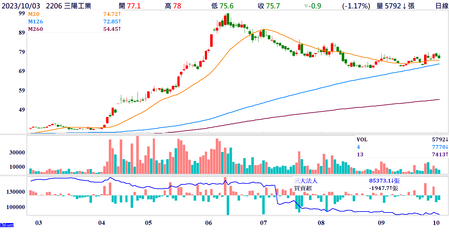三陽股價走勢四月份一度從40元飆漲到99.3元,漲高後近期出現震盪走低修正,時間已經長達四個月,股價也回測70元,跌幅接近30%,以10/3收盤價75.7元計算本益比只有九倍,具長線投資價值。